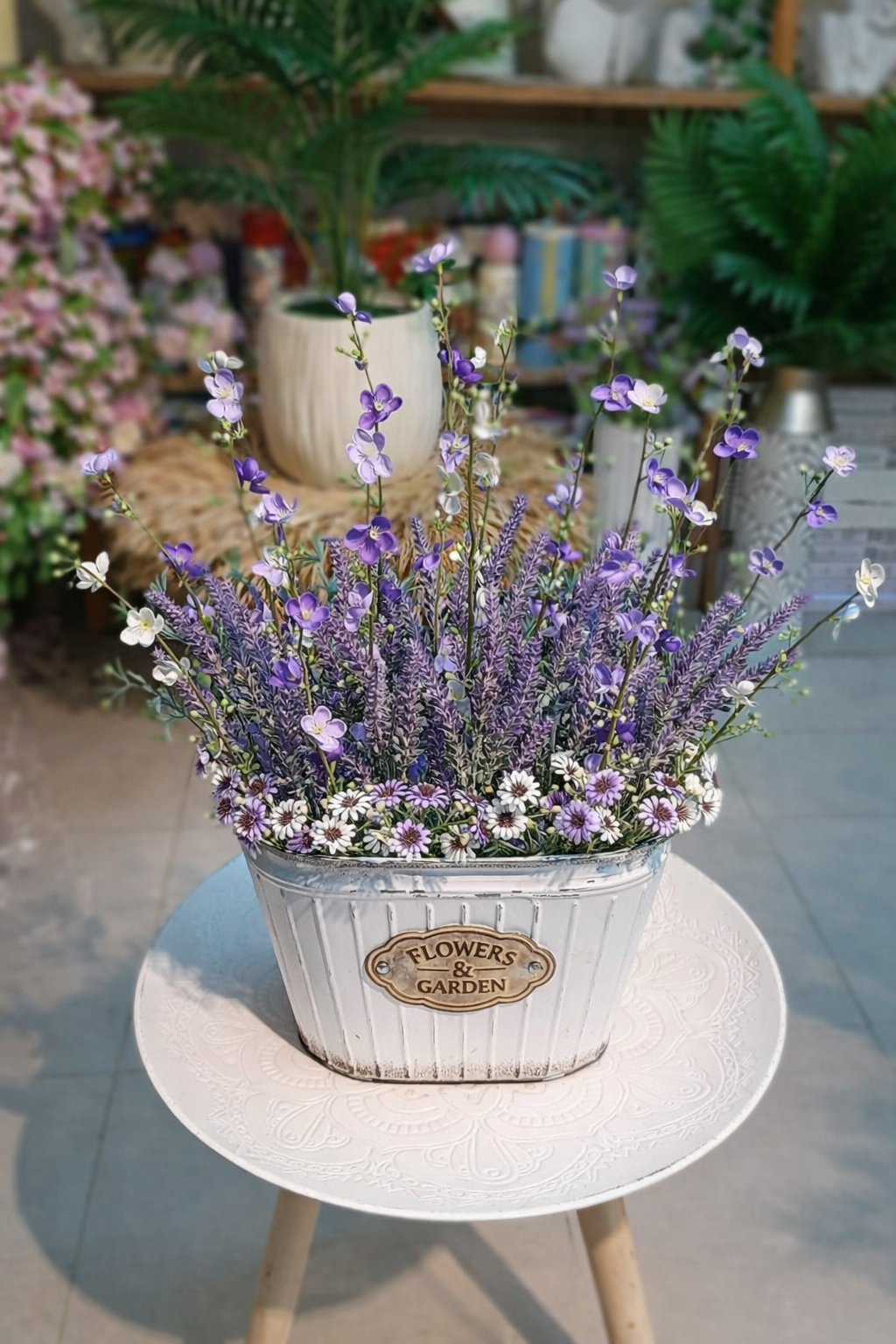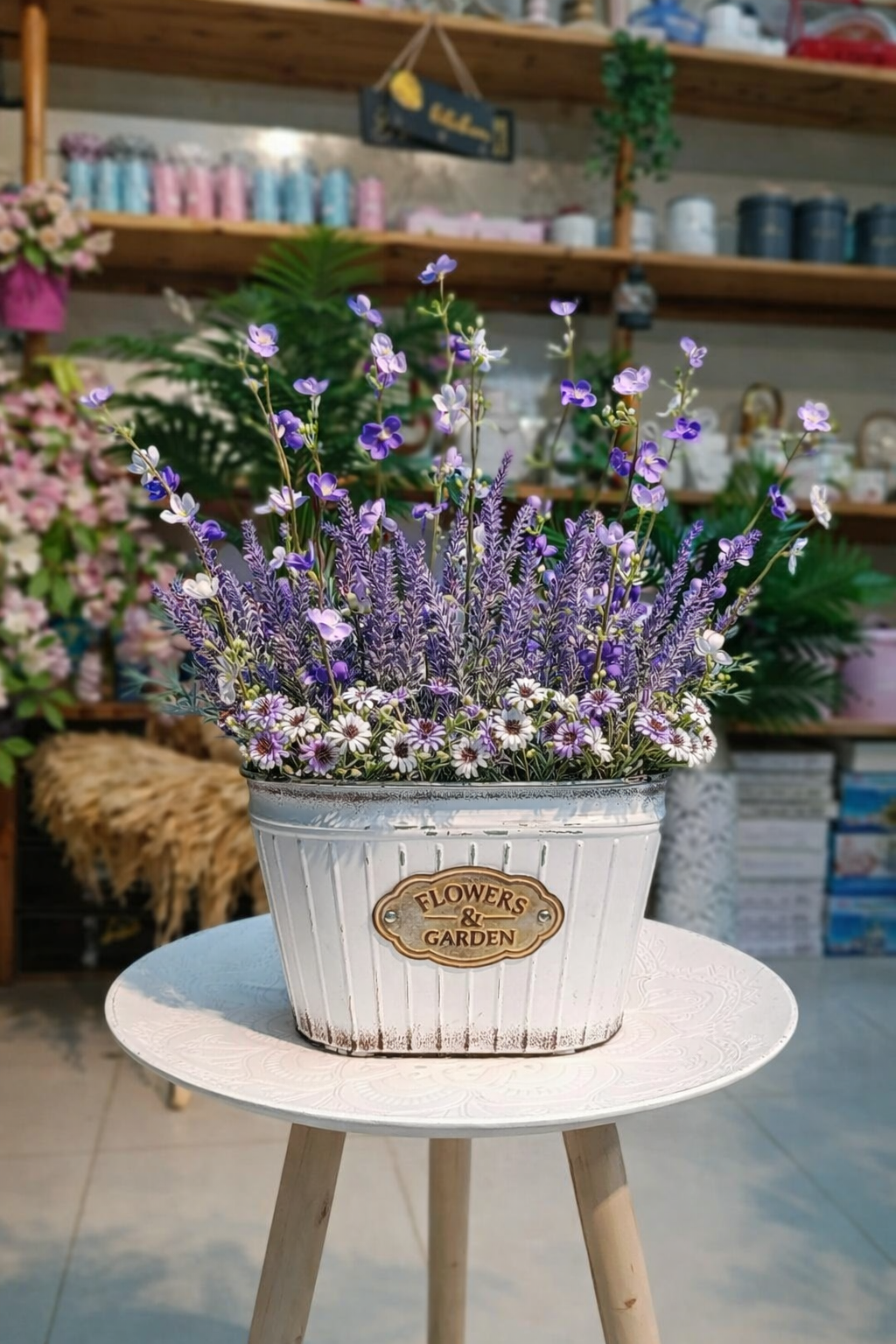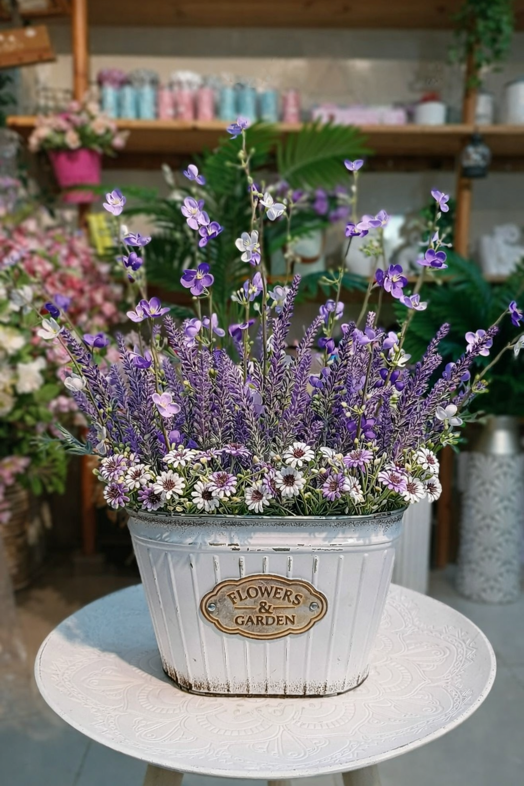 Infuse your home with a touch of nature’s elegance with this exquisite set of handcrafted floral arrangement baskets. Each basket showcases a beautiful mix of colorful blooms, including soft lavender, vibrant daisies, and cascading wisteria, all arranged in a charming, rustic “Flowers & Garden” tin container. These decorative pieces bring life to any room, from the living room to the bedroom, adding a perfect pop of color and sophistication. Ideal for brightening up your home or as a thoughtful gift for loved ones, this floral collection radiates timeless beauty and natural charm.