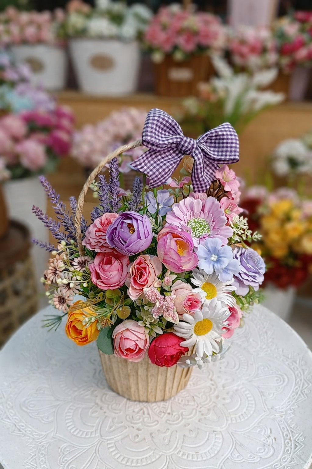 3. Pastel Mixed Blooms: A soothing combination of pink, purple, and blue flowers with delicate accents, all presented in a charming basket with a gingham bow.